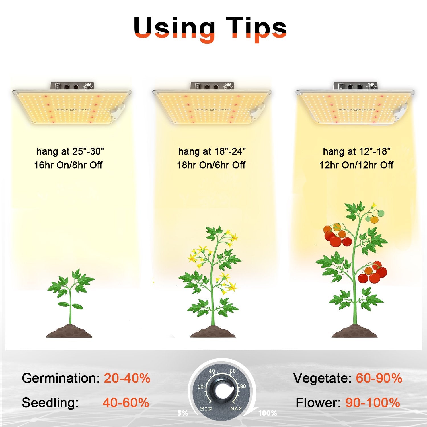 Customized Dimming Design: Upgraded SF series growing lights have a dimming knob and light switch. A single light can be adjusted the light intensity at liberty. Multi-light Connection with unified dimming especially beneficial for large areas of indoor growing and commercial planting.